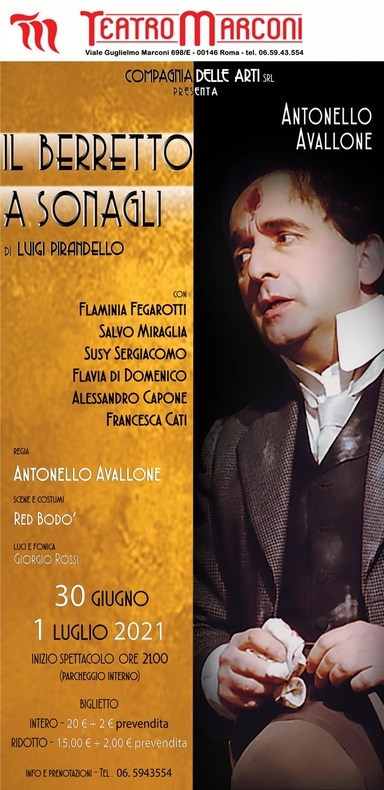 Dopo il lungo periodo di Covid, la Compagnia delle Arti srl tornerà in scena nell’estate 2021 con una riedizione de IL BERRETTO A SONAGLI di Luigi Pirandello, spettacolo che sarà presente, tra l’altro, al Festival della Versiliana 2021, nel mese di Luglio, per la regìa e l’interpretazione di Antonello Avallone.